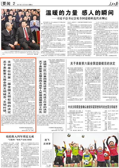 11月17日,全國精神文明建設表彰大會在京舉行。中共中央總書記、國家主席、中央軍委主席習近平在人民大會堂親切會見參加大會的新一屆全國文明城市、文明村鎮(zhèn)、文明單位、文明校園、未成年人思想道德建設工作先進代表和全國道德模范代表,向全體代表表示熱烈的祝賀,勉勵他們再接再厲,在社會主義精神文明建設中再立新功、作出表率。