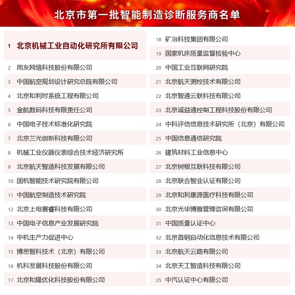 2021年12月22日,北京市經(jīng)濟和信息化局公布了“北京市第一批智能制造診斷服務商”名單,北京機械工業(yè)自動化研究所有限公司(以下簡稱“北自所”)成功入選。