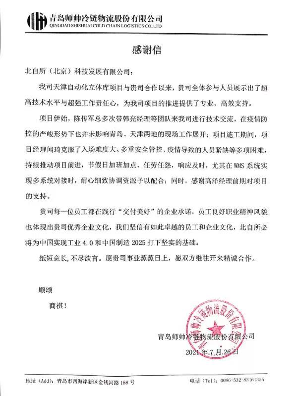 項目執(zhí)行過程中,正值新冠疫情在我國冷鏈行業(yè)肆虐之時,北自科技團隊展示了良好的精神風貌和職業(yè)素養(yǎng),克服了重重困難,以認真的態(tài)度、專業(yè)的管理和過硬的技術感動了客戶,客戶特地發(fā)來感謝信,以表彰北自科技團隊在項目中的突出表現。